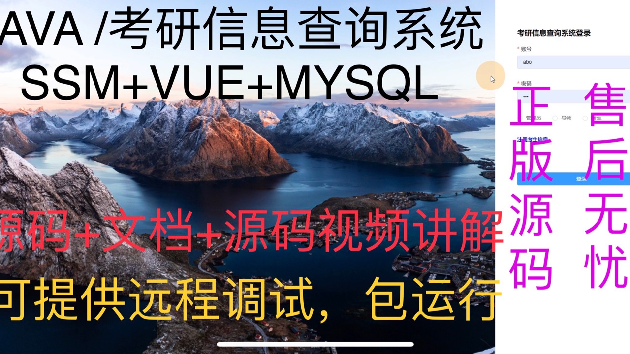 考研信息查询系统|Java|SSM|VUE| 前后端分离 2⃣️:管理端:首页、个人中心、考研资讯管理、学校介绍管理、导师信息管理、考生信息管理、专业信息管理、设施申请管理、项目信息管理、系统管理。4⃣️:技术栈:Java、Mysql、SSM、Mybatis-Plus、VUE、jquery,html。5⃣️:前台端:首页、景点介绍、导师信息、学校介绍、专业信息、项目信息、论坛、在线客服。3⃣️:开发环境:IDEA、JDK1.8、Maven、Mysql5.7+3⃣️:考生端:首页、个人中心、设施申请管理。4⃣️:导师端:首页、个人中心、设施申请管理。