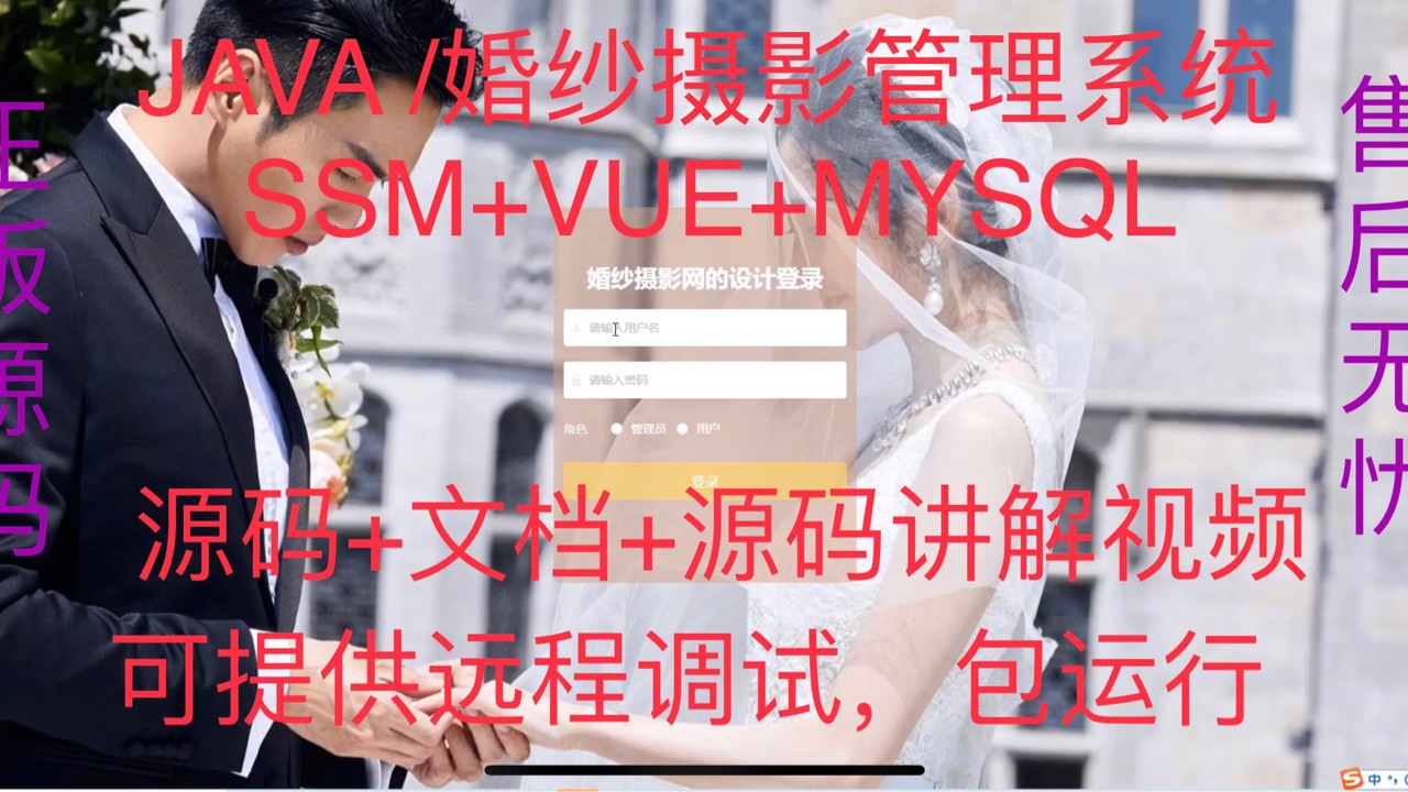 婚纱摄影管理系统|Java|SSM|VUE| 前后端分离 2⃣️:管理端:首页、个人中心、用户管理、套餐系列管理、摄影套餐管理、摄影订购管理、摄影预约管理、摄影评价管理、客片欣赏管理、系统管理。4⃣️:技术栈:Java、Mysql、SSM、Mybatis-Plus、VUE、jquery,html。3⃣️:开发环境:IDEA、JDK1.8、Maven、Mysql5.7+4⃣️:前台端:首页、个人中心、摄影套餐、摄影资讯、在线客服。【重要3⃣️】虚拟可复制品不支持退换货。
