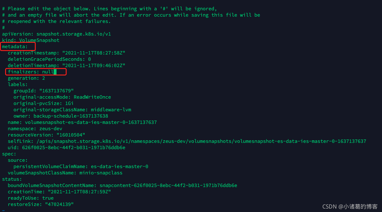3、编辑资源,将metadata.finalizers的值设置为null