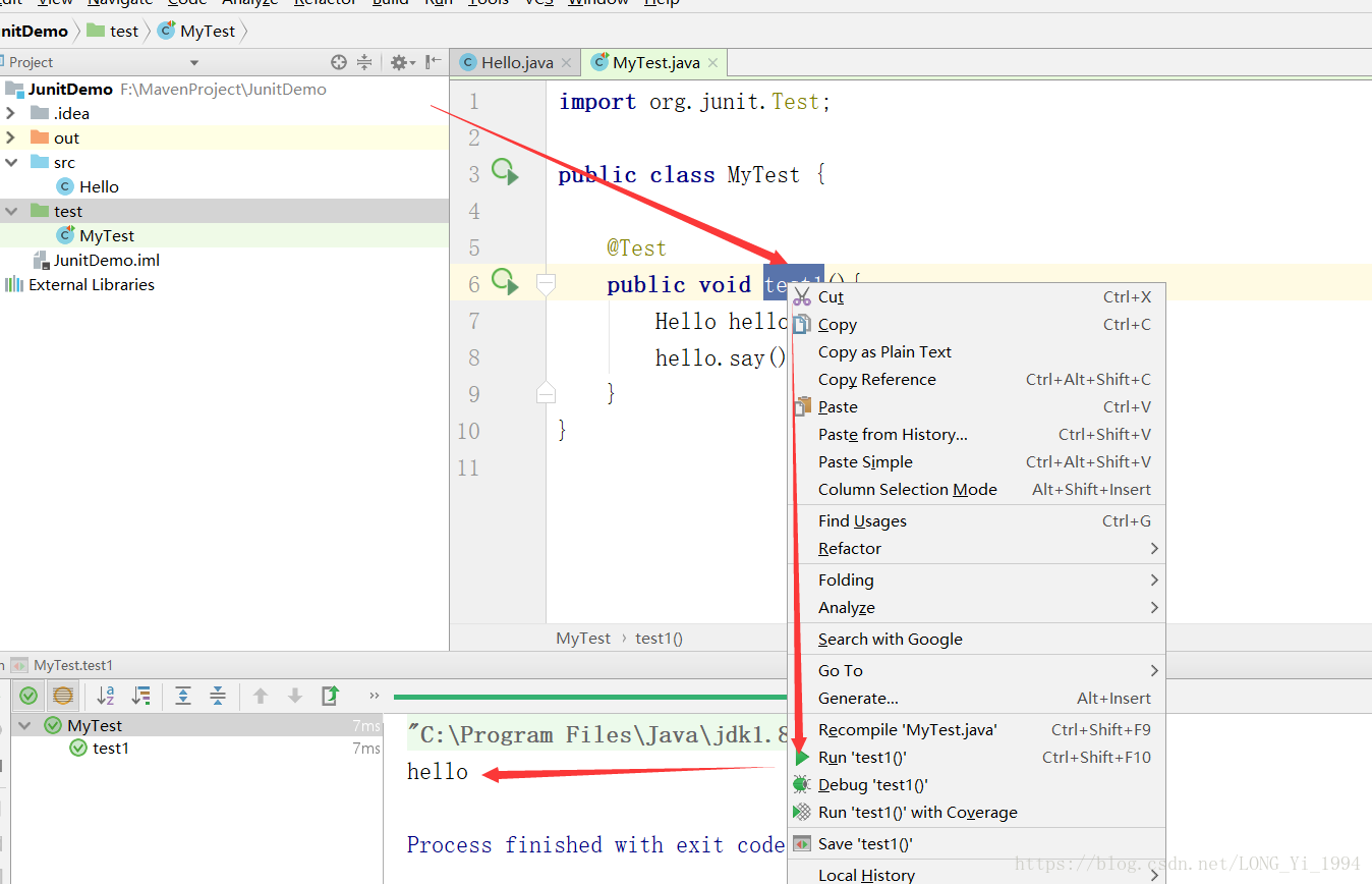 5:创建一个被测试类(Hello),并编写一个要测试的方法(say())