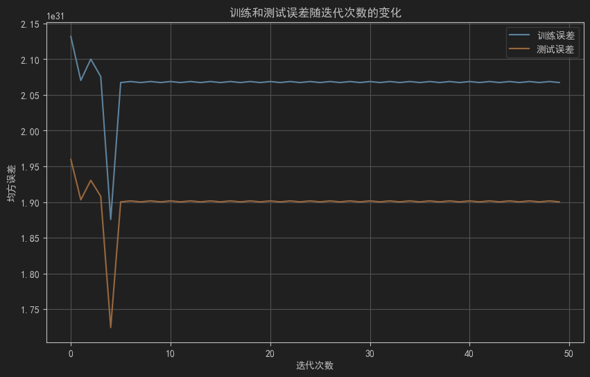 - 每次迭代中使用小批量数据进行训练,并记录训练误差和测试误差,以及模型系数。