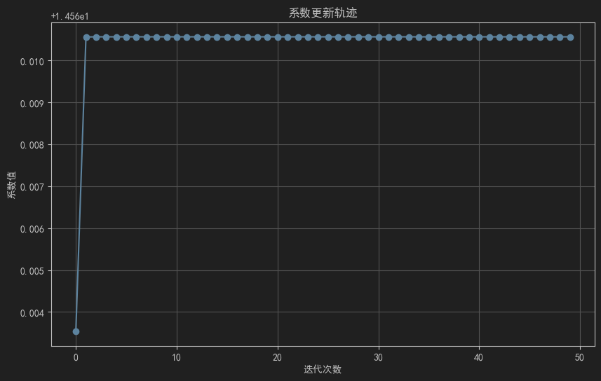 - 参数更新的轨迹图:展示模型系数在每个 epoch 的更新情况。