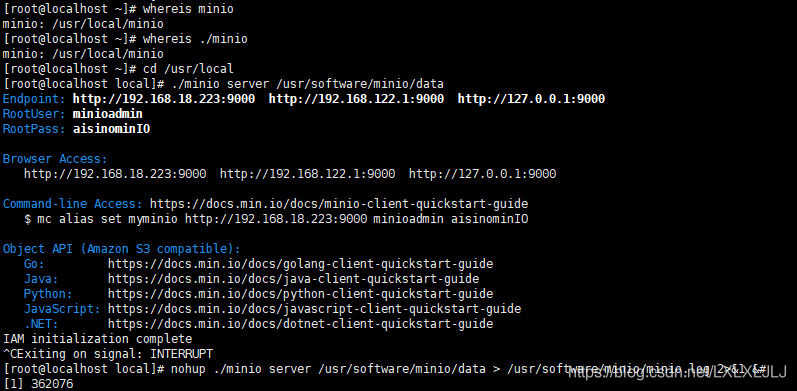 nohup ./minio server /usr/software/minio/data > /usr/software/minio/minio.log 2>&1 &#