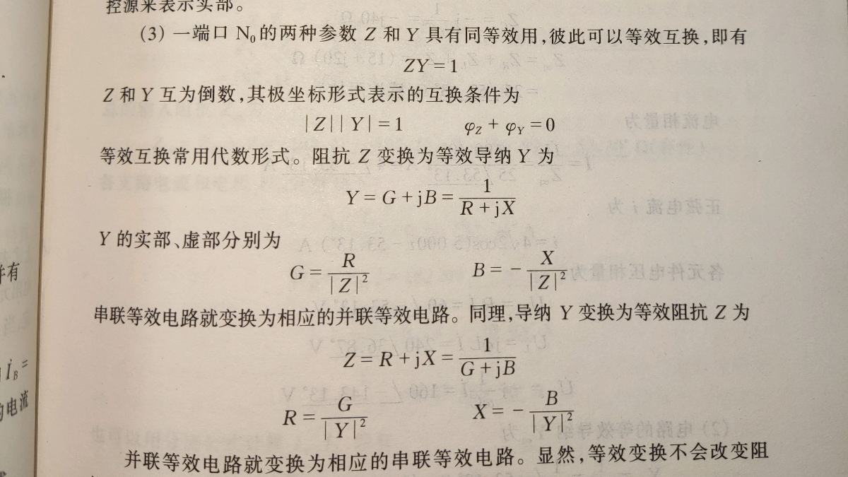这个说法里“导数”估计是“倒数”的意思,我想说,按照这样的说法是不是可以理解为G=1/R,B=1/X,然后Y=G+jB?Y=G+jB是对的,但是G=1/R,B=1/X显然是错的,原因看前面的图,里面有相应公式。图片来自《电路》第5版高等教育出版社(原著邱关源,修订罗先觉)。导纳——电导与电纳复合参数,实部为电导,虚部为电纳,单位西门子”首先符号上,电阻R,电抗X,阻抗Z,电导G,电纳B,导纳Y。我是电路初学者,如果有说错的地方欢迎指正。“电导——电阻的倒数,单位西门子。电纳——电抗的导数,单位西门子。