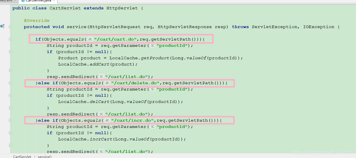 2、在实现HttpServlet接口的service方法里,拿到request对象的路径属性,一个个比对,然后执行相应的方法