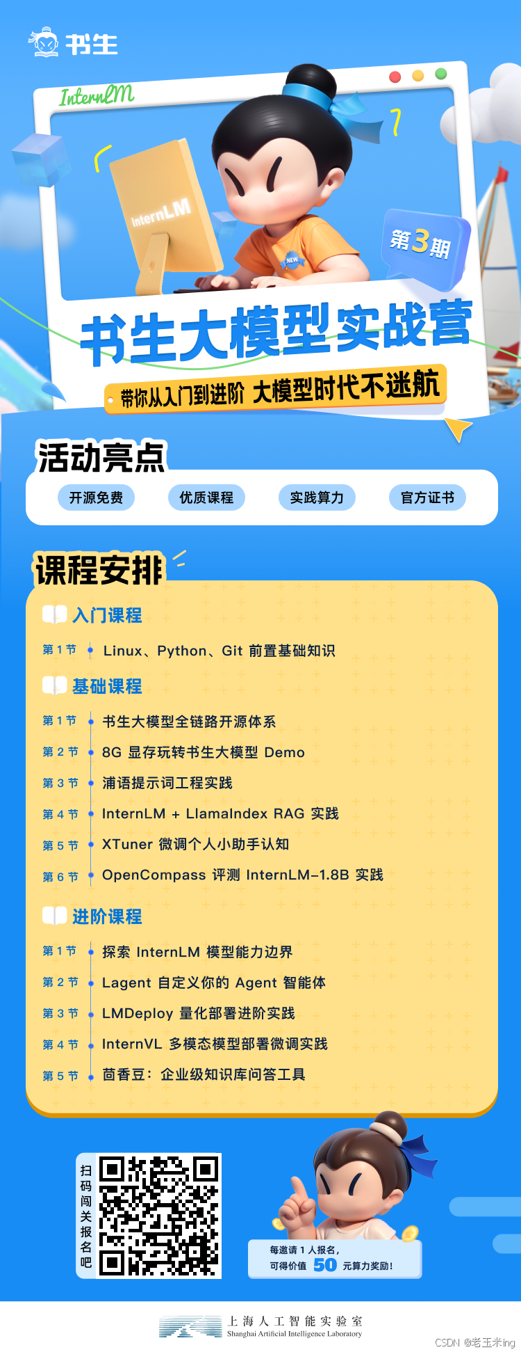 书生·浦语(InternLM)-大模型实战营-春节课程-作业6 训练营课程首页:https://github.com/internLM/tutorial?书生浦语项目首页:https://github.com/InternLM/InternLM。课程简介(个人认知):介绍书生浦语开源平台体系,教会使用平台。