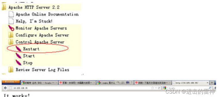 装 完后你会多出一个这样的图标来,点击该图标,里面有用于控制apache http server的启动、停止与重启等操作选项。同时在你们的“服务”面板中,也能发现这样的一个服务项,它启动时默认是随着系统的启动而启动的,我们把它改 成“手动”吧,因为将来我们还要安装IBM Http Server来作练习。