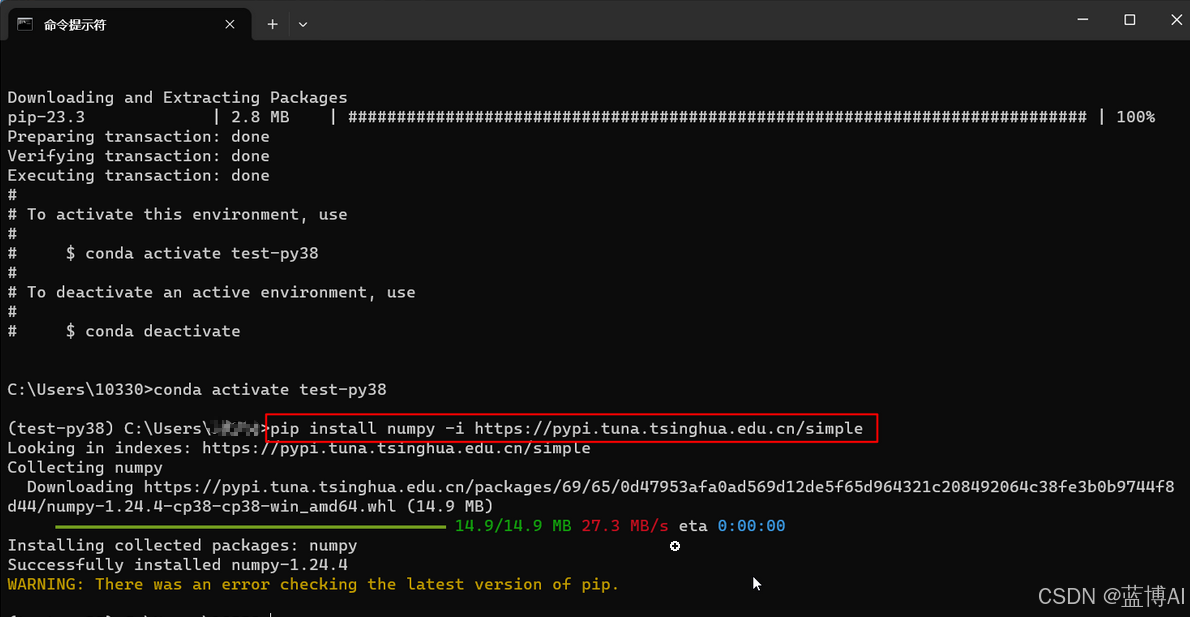 (3) 进入到 test-py38 虚拟环境后就可以在此环境中安装需要的包,例如我这里安装numpy包,则输入命令 pip install numpy -i https://pypi.tuna.tsinghua.edu.cn/simple,其中 -i https://pypi.tuna.tsinghua.edu.cn/simple 是指用清华源的numpy资源能够更快的安装