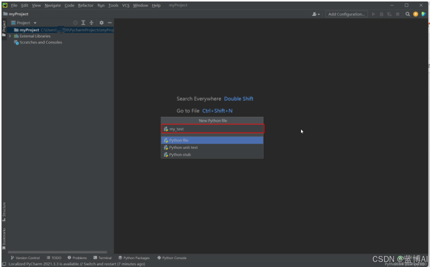 (1)鼠标右键myProject项目文件夹,选择 New->Python File