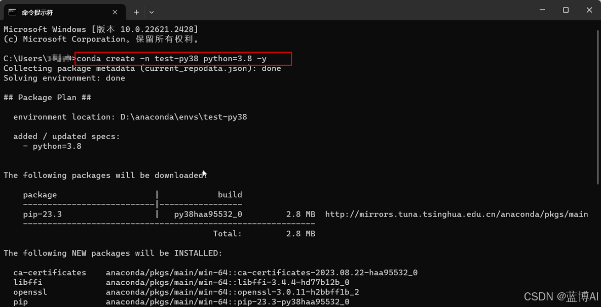(1)打开终端(cmd),输入 conda create -n test-py38 python=3.8 -y 命令,然后按下回车键,创建一个名为 test-py38 的虚拟环境,并在虚拟环境中安装3.8版本的python