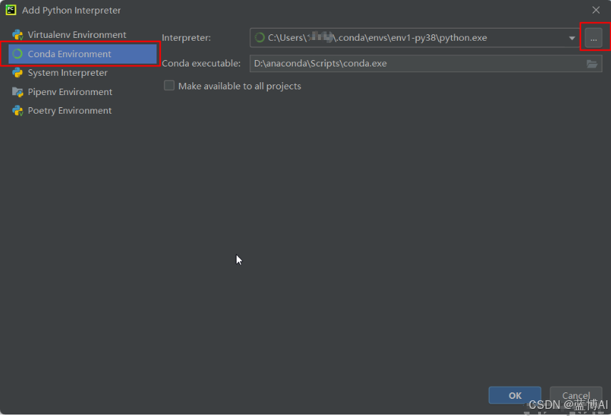 (5)选择 Conda Enviroment,然后点击后面的 ...