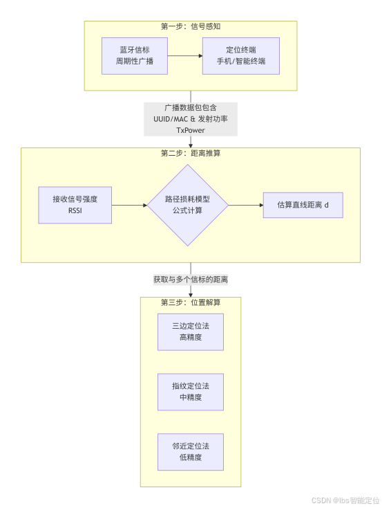 信号强度(RSSI)随着传播距离而衰减,终端通过接收信标的RSSI值,结合信标预设的发射功率,反推出到每个信标的直线距离,实际过程中会校准不良环境对信号的干扰,降低误差。