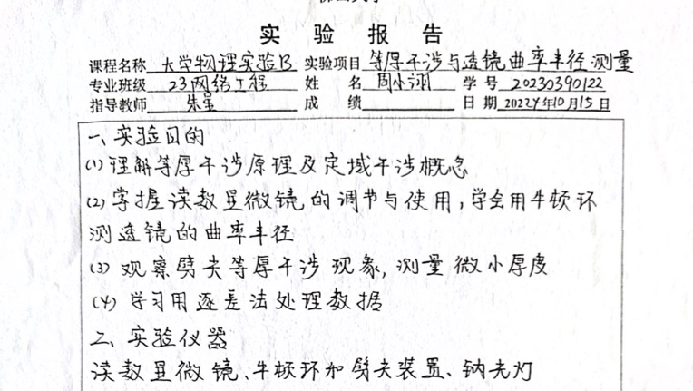 《等厚干涉与透镜曲率半径测量》大学物理实验报告