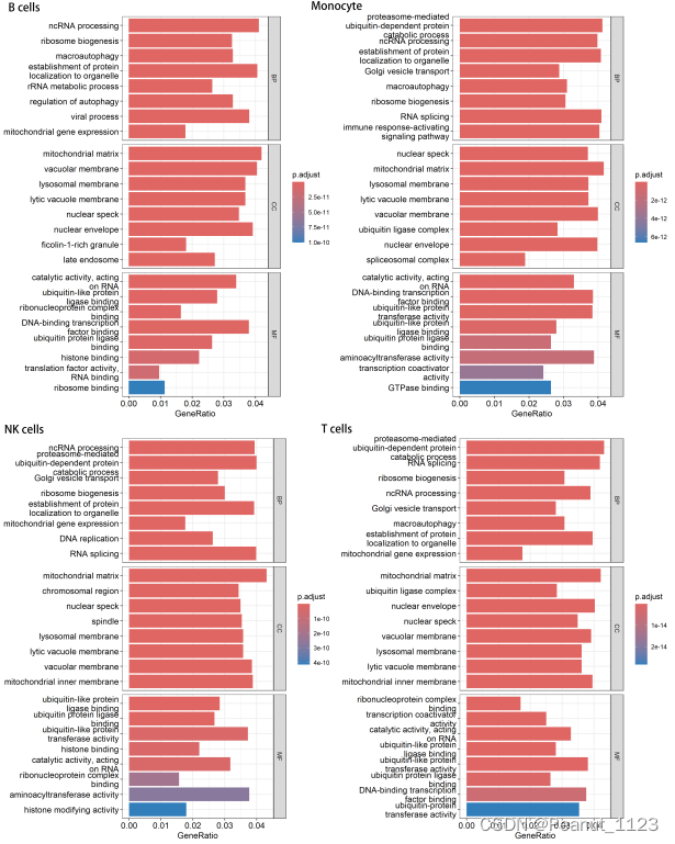 barplot(eg,x="GeneRatio",color="p.adjust",showCategory=8,split="ONTOLOGY")+facet_grid(ONTOLOGY~.,scale='free')