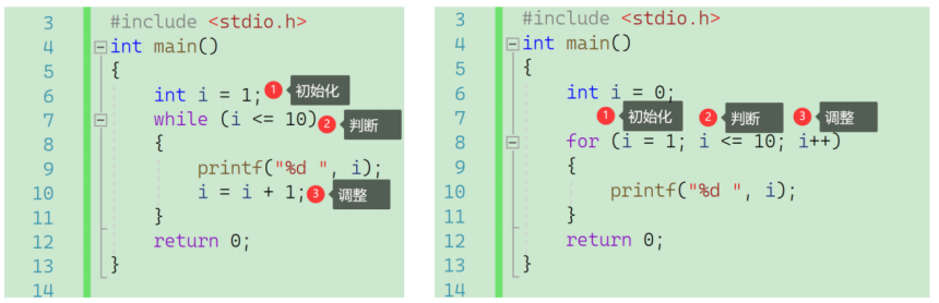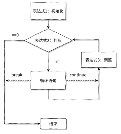 首先执行表达式1初始化循环变量。接下来就是执行表达式2的判断部分,表达式2的结果如果为假,则循环结束;表达式2的结果如果为真,则执行循环语句。循环语句执行完后,再去执行表达式3,调整循环变量,然后再去执行判断表达式2的结果是否为0,决定循环是否继续。整个循环的过程中,表达式1初始化部分只被执行1次,剩下的就是表达式2、循环语句、表达式3在循环。