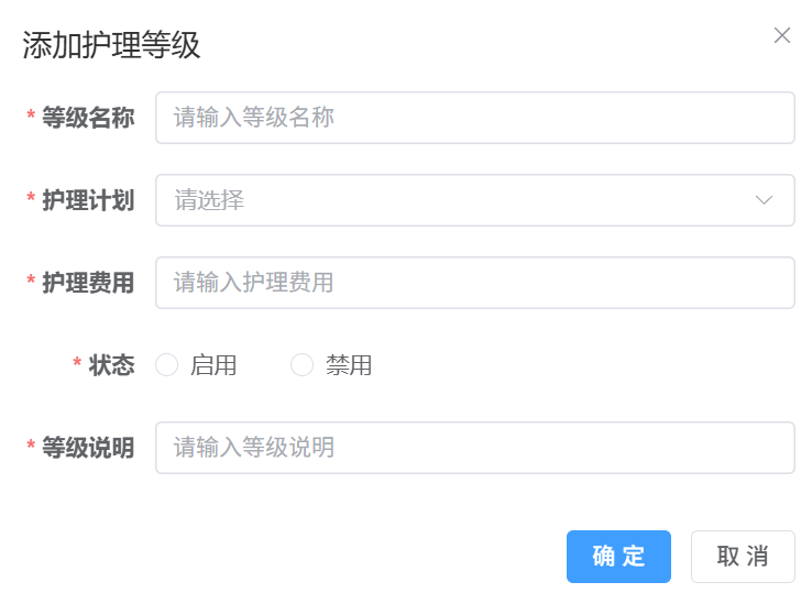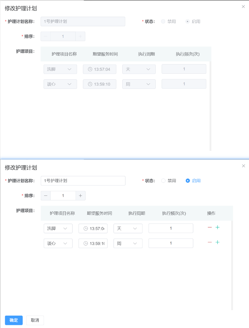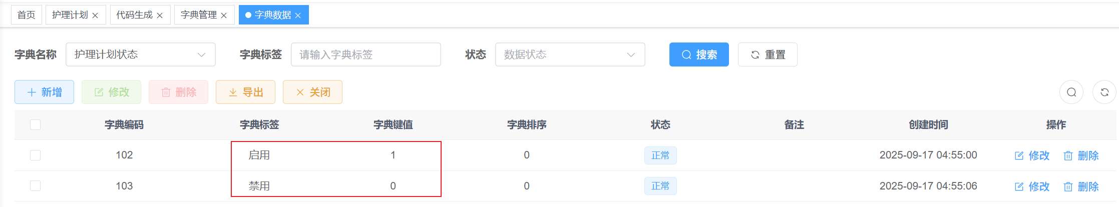 新建字典nursing_plan_status(护理计划状态)再点入字典类型添加两个状态: