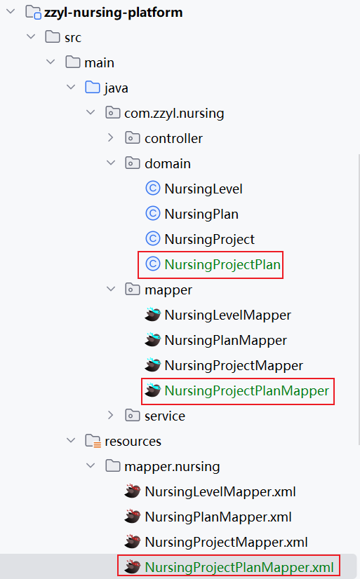 在若依系统代码生成当中导入nursing_project_plan表,然后将生成的NursingProjectPlan实体类、Mapper接口及其xml文件导入到项目当中: