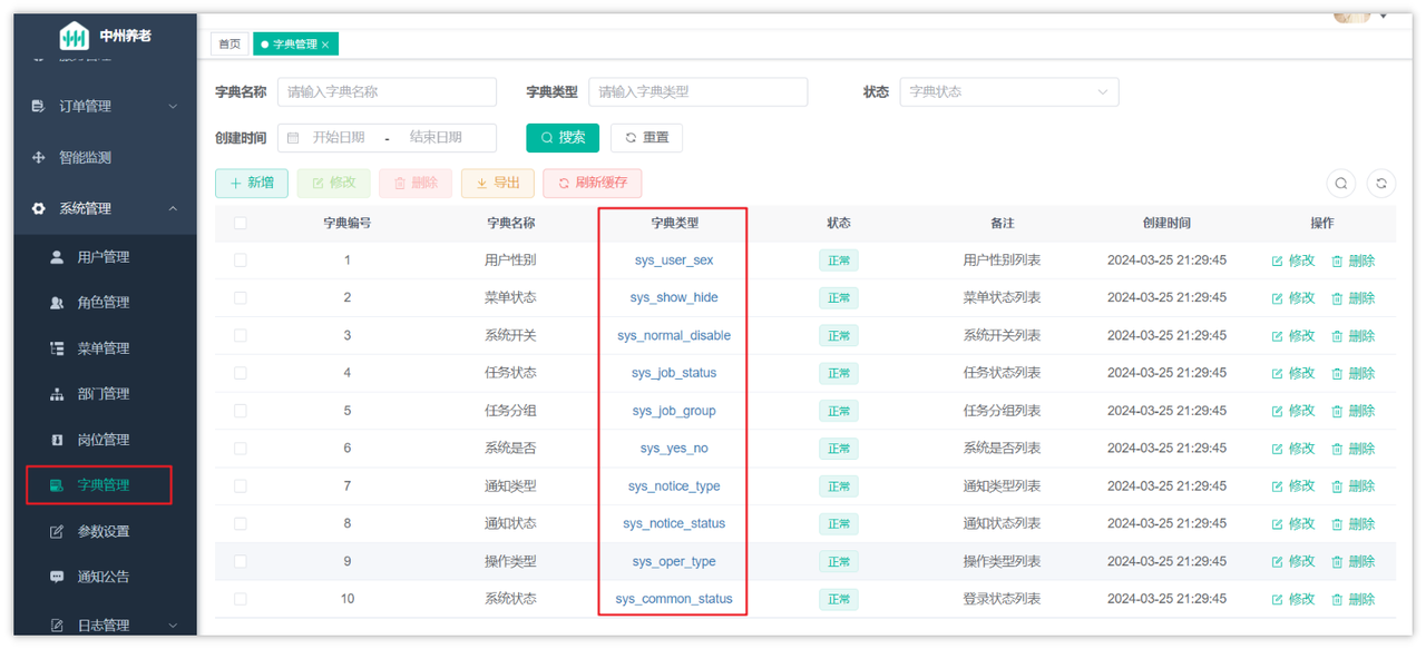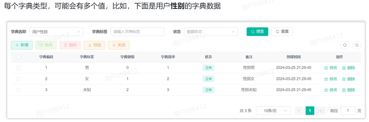 字典管理用来维护字典类型的数据,例如:状态的启用、禁用;性别的男、女;订单的已下单、支付中、已完成;通常用在如下拉框、单选按钮、复选框、树选择中的数据中,方便系统管理员维护。