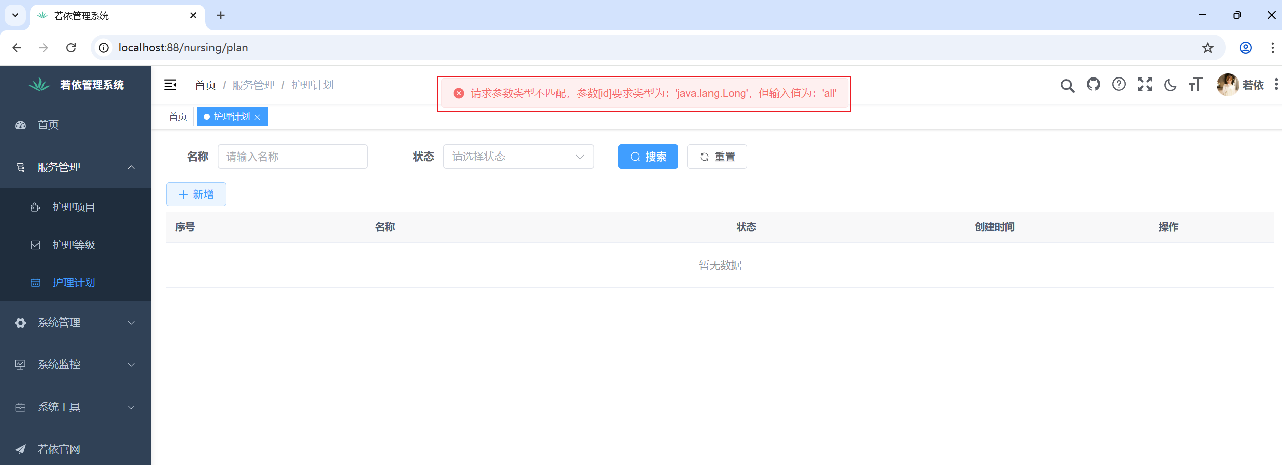 ②将刚才的问题更正之后发现了另一个问题:在前端页面新增护理计划的时候,护理名称没有显示并且状态居然为禁用(我们设置为启用),经过断点排查发现,执行insert语句的时候,参数是空的,这是由于前面进行参数拷贝的时候从哪拷贝到哪弄反了,导致把空的参数给到了insert方法,因此加入数据库的内容都为null,更正过后进行测试问题得以解决