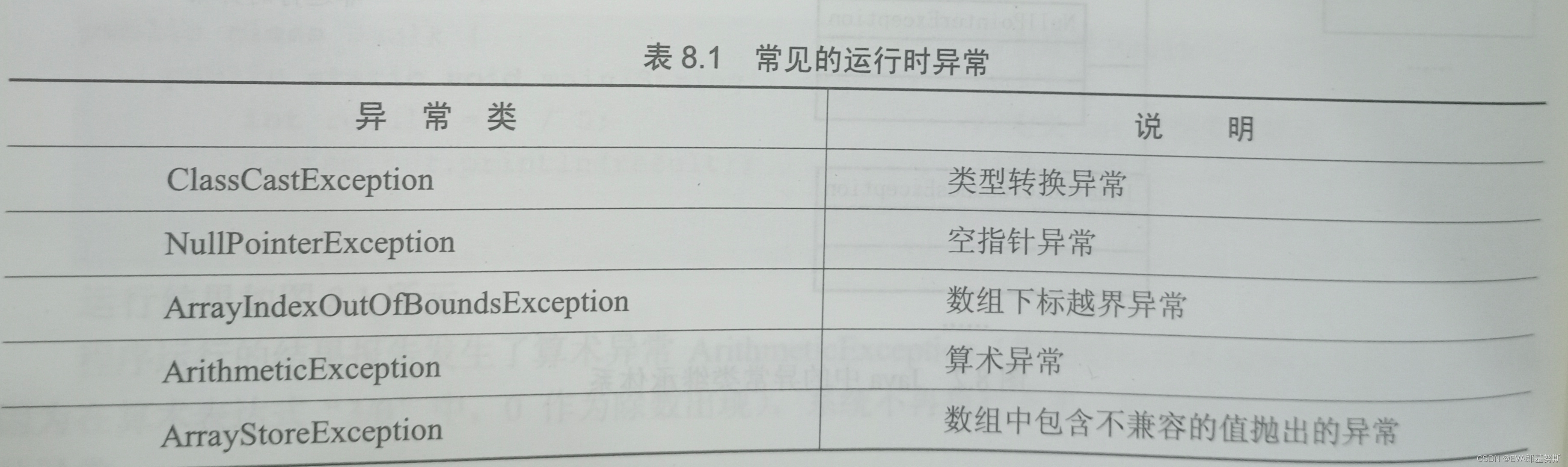 Java中提供了常见的RuntimeException异常,这些异常可通过try..catch语句捕获,如表8.1所示: