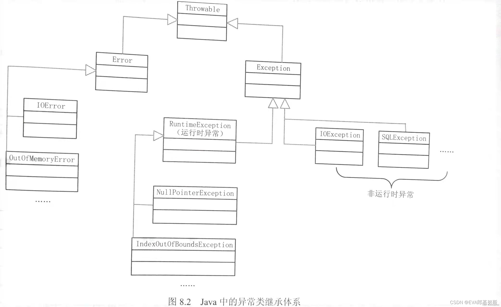 Java类库的每个包中都定义了异常类,所有这些类都是Throwable类的子类。Throwable类派生了两个子类,分别是Error类和Exception类,其中,Eror类及其子类用来描述Java运行系统中的内部错误以及资源耗尽的错误,这类错误比较严重。Exception类称为非致命性类,可以通过捕捉处理使程序继续执行。Exception类又可以根据错误发生的原因分为运行时异常和非运行时异常。Java中的异常类继承体系如图8.2所示: