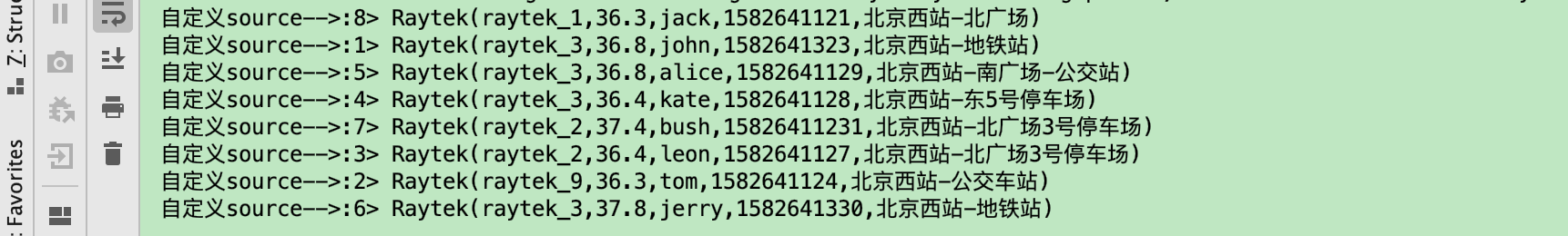 kafka-->:1> raytek_3,36.8,john,1582641323,北京西站-地铁站