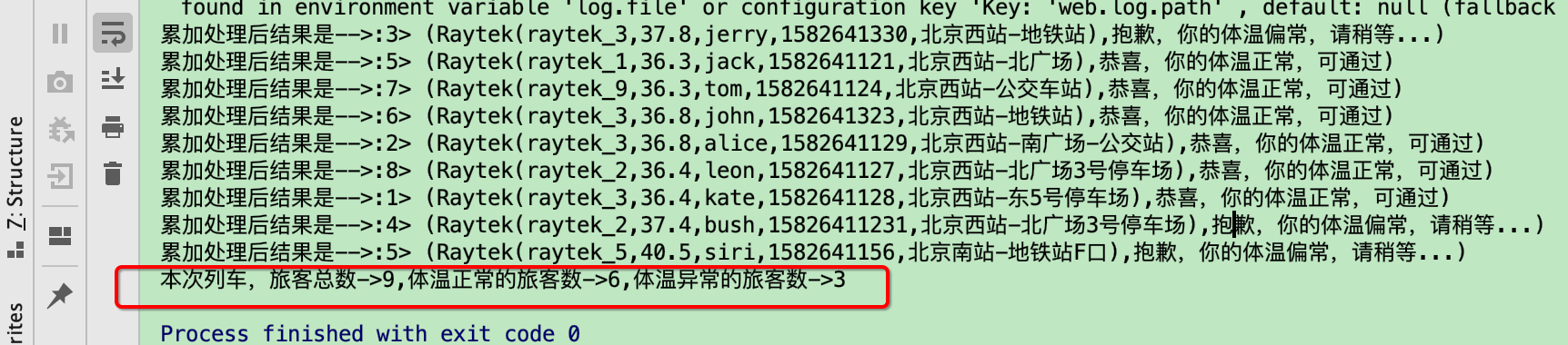 println(s"本次列车,旅客总数->$totalCnt,体温正常的旅客数->$normalCnt,体温异常的旅客数->$exceptionCnt")