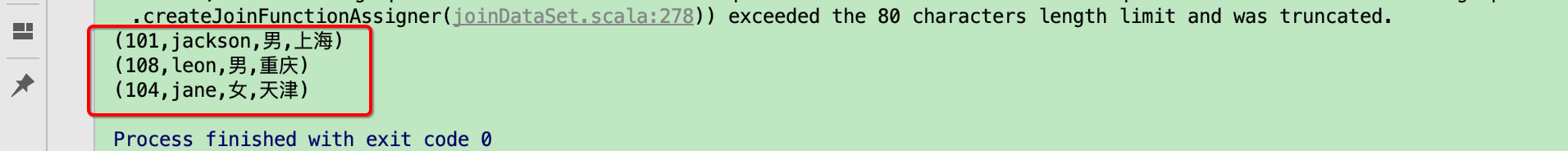 val ds2 = env.fromElements((101,"jackson",1,"上海"),(104,"jane",2,"天津"),(108,"leon",1,"重庆"))
