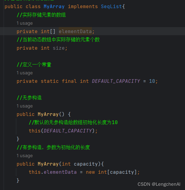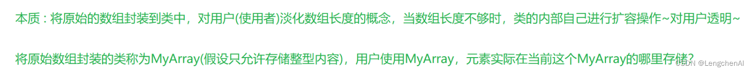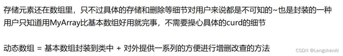 2. 由于原始的数组存在定长的问题,因此需要将原始数组封装到自定义的类中,让它具备可扩展的能力,同时将增删改查的基本操作也封装在其中=》即对使用者来说,提供给用户的是一个动态数组,用户无需关心数组的长度问题,只需要使用提供的增删改查基本操作即可。