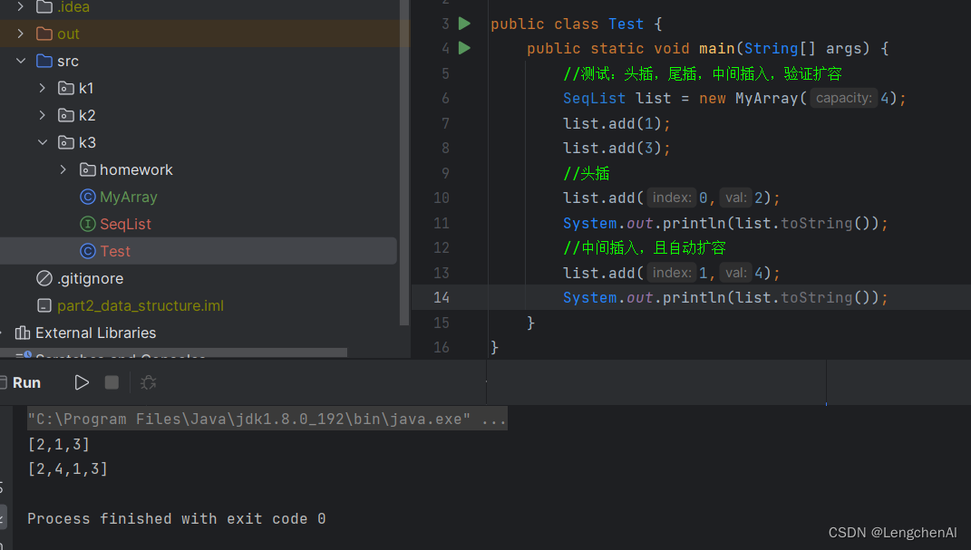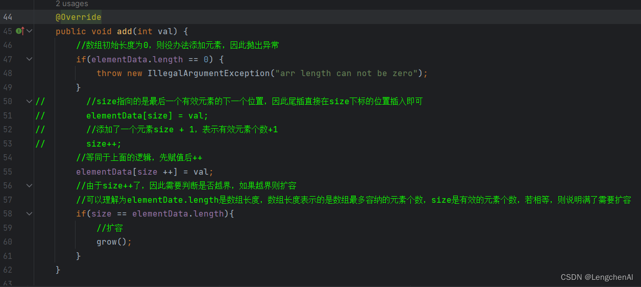 注意1:在索引位置插入一个元素的方法中,若在尾插的逻辑后面不return,则在执行完尾插之后,又会插入一个元素。也就是尾插之后size ++ ,导致index比size小一位,for循环将index的位置往后挪动一位,然后将index的位置添加一个元素,相当于插入了两个元素。
