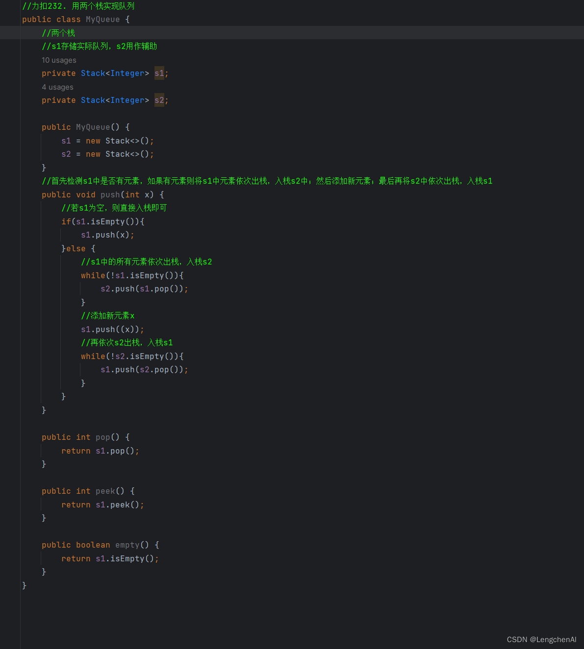 a. s1用来存储队列,栈顶为队首; s2作为辅助,用来缓存s1之前的元素,保证之前元素的相对顺序正确