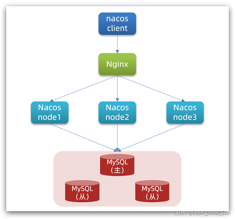其中包含3个nacos节点,然后一个负载均衡器代理3个Nacos。这里负载均衡器可以使用nginx。