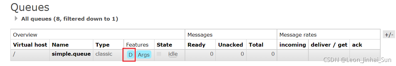 可以在RabbitMQ控制台看到持久化的队列都会带上D的标示: