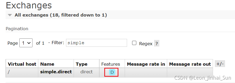 可以在RabbitMQ控制台看到持久化的交换机都会带上D的标示: