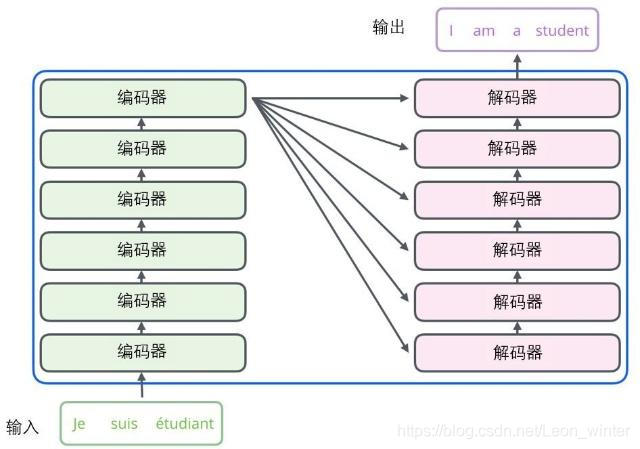 transformer在《attention is all you need》中继续沿用encode-decode结构,如上图,encode就是左边部分,decode就是右边部分,在encode中又包含很多层编码器,每一层编码器由一个多头attenion子层和一个前向神经网络子层构成,每一子层有一个残差结构;在decode中也包含很多层解码器,每一层解码器由一个masked多头attention子层、一个多头attention子层和一个前向神经网络子层构成,每一子层也是一个残差结构。所以上图的encode和decode都只画了一个层,每一层包含2,3个子层。多画几层就是下面的结构