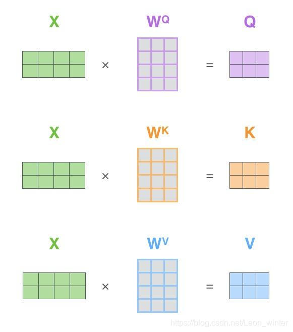 上图中, W Q , W K , W V W^Q,W^K,W^V WQ,WK,WV矩阵就是神经网络需要学习的参数,X就是输入向量拼接后,形成的矩阵。