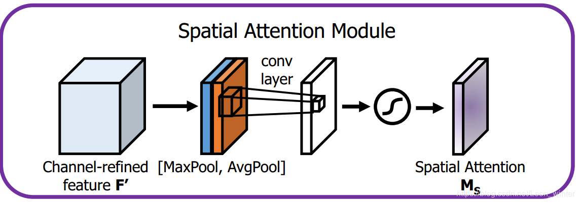 Spatial Attention对于输入 F ′ F' F′,其size为 < B , C , H , W > <B, C, H, W> <B,C,H,W>,首先在Channel维度上使用最大池化和平均池化,得到两个 < B , 1 , H , W > <B, 1, H, W> <B,1,H,W>,经过concatenation得到 < B , 2 , H , W > <B, 2, H, W> <B,2,H,W>,使用卷积操作经过激活函数得到最终的输出 < B , 1 , H , W > <B, 1, H, W> <B,1,H,W>。