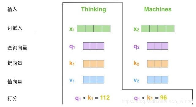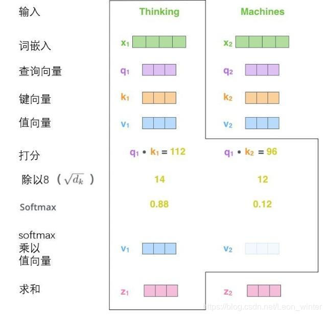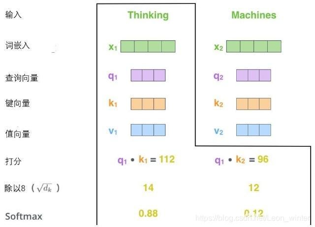 首先对输入的sequence的每一个token进行词嵌入,同时每一个token又会有一个查询向量 q q q,键向量 k k k和值向量 v v v,上图假设输入的sequence有两个token,分别是Thinking和Machines,我们想知道Thinking这个单词和这个sequence的所有token的相似度,我们就用Thinking的查询向量 q 1 q_1 q1,点乘每个token的键向量 k i , i = 1 , 2 k_i, i=1,2 ki,i=1,2。