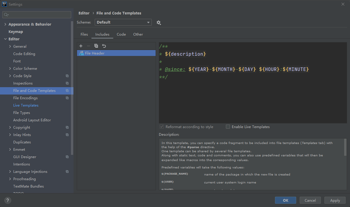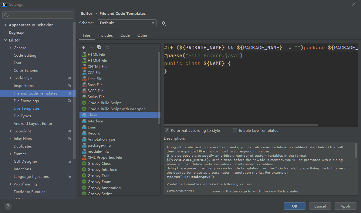 File and Code Templates 设置是我们创建指定文件、类、枚举、代码等不同类型文件时所用的模板。