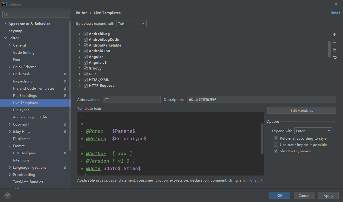 在每个选项卡下都有一下模块:模板列表、模板预览、描述。 模板列表:可以对模板进行新增、删除、复制等操作。 模板编辑:对选中模板内容进行编辑,通过勾选可以实现: 根据风格重新格式化 启用 Live Templates 描述:是对配置用法进行说明。