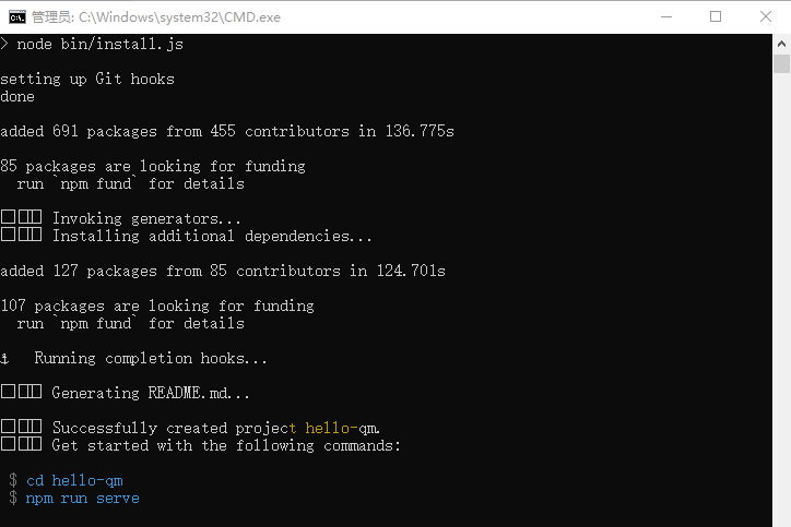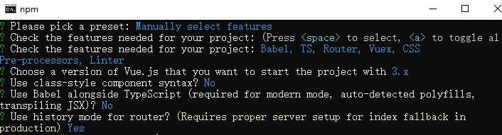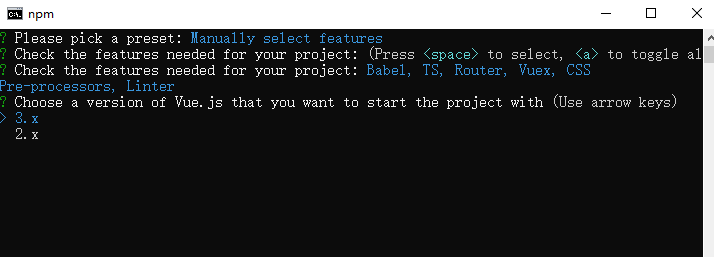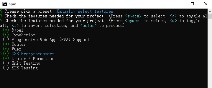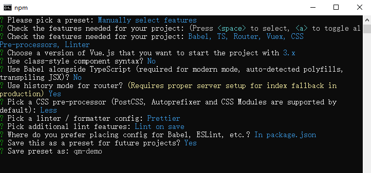 5, 创建名为hello-qm的项目: vue create hello-qm,本次演示不需要默认demo,选择了manually select features