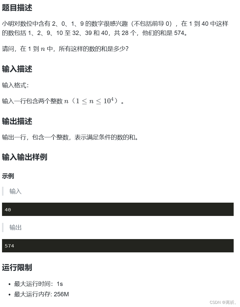 特别数的和 是否是 ‘0’、‘1’、‘2’ 或 ‘9’ 中的一个。这样,该程序就完成了计算包含数字 0、1、2 或 9 的整数的总和的任务。语句来跳出内部循环,因为我们只需要找到一个符合条件的数字即可。的值,即包含数字 0、1、2 或 9 的整数的总和。:首先,从标准输入流中读取一个整数,存储在变量。,用于存储满足条件的整数的总和。中包含数字 0、1、2 或 9,将当前整数。,用于存储将要检查的每个整数的字符串表示。中的每个字符,并将当前字符赋值给变量。:内部循环中的条件语句,检查当前字符。变量中,以便计算总和。