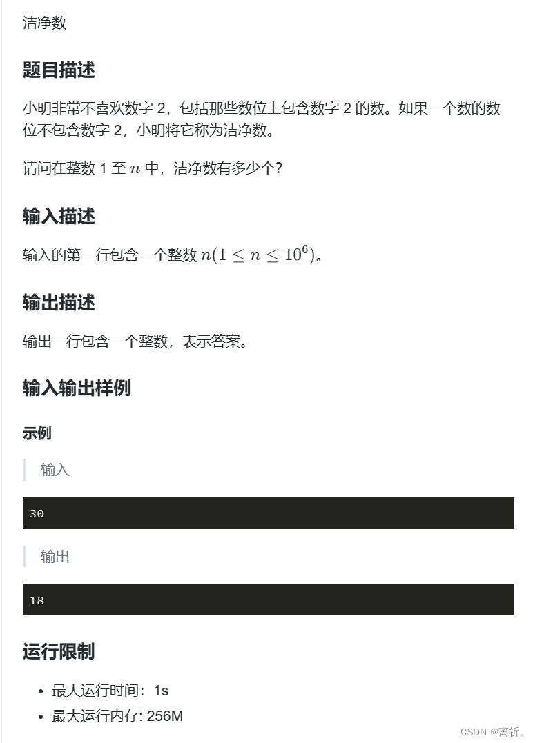 【结净数】 通过这段代码,我们可以有效地统计从 1 到输入的数字 n(包括 n)之间,所有不含有数字 2 的整数的个数,并输出结果。这是因为只要当前数字含有数字 2,就不符合条件,无需继续遍历。,用于记录不含有数字 2 的整数的个数。:输出统计结果,即不含有数字 2 的整数的个数。:外部循环,从 1 开始遍历到输入的数字 n。转换为字符串,以便后续遍历每个数字的每一位。,用于标记当前数字是否包含数字 2。:如果当前数字的某一位是数字 2,将。,表示当前数字不含有数字 2,因此将。:内部循环,遍历当前数字的每一位。
