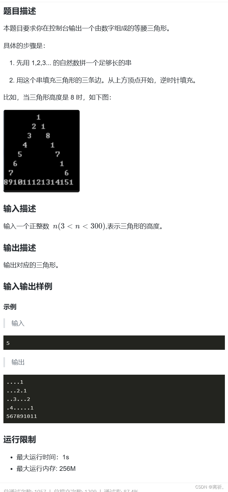 【无标题】 这段代码的目的是生成一个数字三角形,其中每一行的数字按照特定的规律排列。等于当前行的数字应该开始输出的位置,则输出对应位置的数字。等于当前行的数字应该结束输出的位置,则输出对应位置的数字。:如果当前位置不是应该输出数字的位置,则输出一个点号,用于填充数字之间的空白。:外部循环,控制数字三角形的行数,从第二行开始循环,直到第。:在每行输出结束后,输出一个换行符,以换行输出下一行的数字。初始化为 -1,用于记录当前要输出的数字的索引。,即数字三角形中数字的总数量。,用于存储数字三角形中的数字。