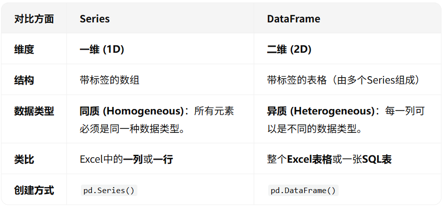 在Python的Pandas库中,DataFrame 是一个二维的、大小可变的、带有标签的数据结构,你可以把它想象成一个电子表格(如Excel)或SQL数据库中的表。它由行(rows)和列(columns)组成,每一列都可以是不同的数据类型(如数字、字符串、布尔值等)。DataFrame是Pandas中最核心、最常用的数据结构,广泛用于数据清洗、处理、分析和可视化。