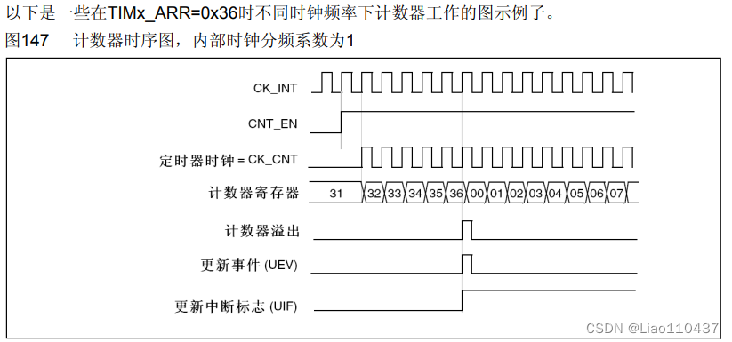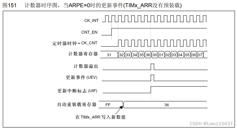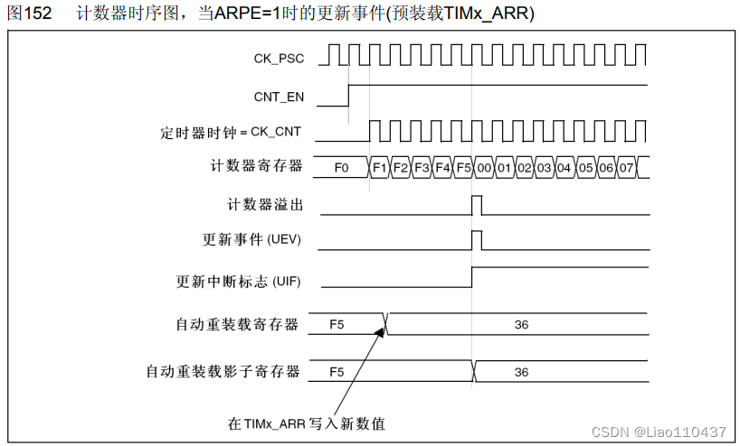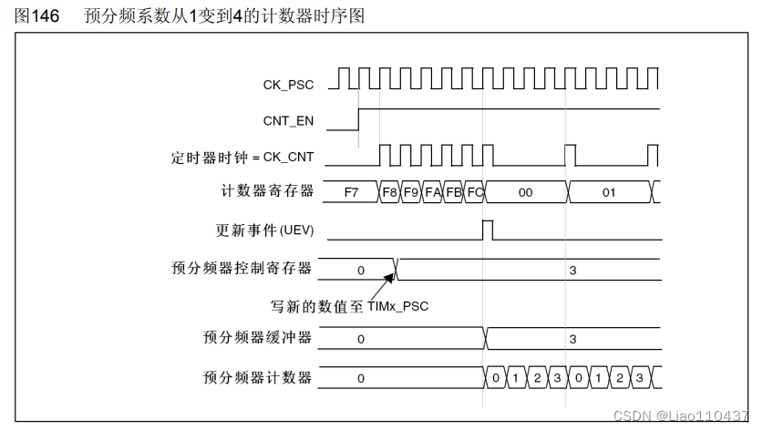 CK_PSC是预分频寄存器,CNT_EN是计数器使能,可以发现在计数开始后,改变了预分频寄存器的值,但还是按照原来的频率计数,直到计数值达到FC(这就是自动重装值)重新计数时才改变了计数频率。可以发现在预分频控制寄存器下面还有个预分频器缓冲器,正真起作用的时这个缓冲寄存器(也叫影子寄存器),当预分频器被重新写入时,产生了更新事件之后影子寄存器才发生改变。