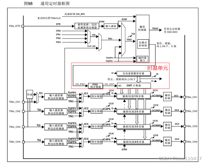 通用定时器的结构图就复杂一点了,结构图的左上部分是时钟的选择,除了选择内部时钟外,还能选择外部时钟TIMx_ETR、TI1FP1、TI2FP2、以及定时器级联,当更新事件通过TRGO接到其他时钟作为其他定时器的时钟源就实现了定时器的级联。结构图下面部分是输入捕获和输出比较的部分,用于捕获波形和输出PWM波形。通用定时器的时基单元除了自增计数,还可以自减计数和中央对齐计数。