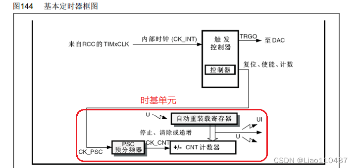 基本定时器的时钟可以认为来自于内部时钟,一般都是72MHz。下面有三个重要的寄存器,预分频器、计数器和自动重装载寄存器,时钟经过分频之后,计时器计数,当计数值达到重装值之后会产生一个更新中断(UI)或更新事件(U),更新中断经过NVIC处理之后就会交给CPU处理, 更新事件不会让CPU处理,而是触发其他外设的操作。