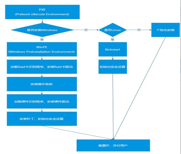 如下图所示,整个流程采用通用的框架,首先由PXE启动,选择需要安装的操作系统类型(安装Windows或者Linux),然后根据Windows系统自动识别出需要安装的驱动。服务器交付用户之前,会进行基本的安全设置,例如防火墙设置以及关闭Windows共享,这在一定程度上提高了安全性,也减少了需要人工做的一些操作。