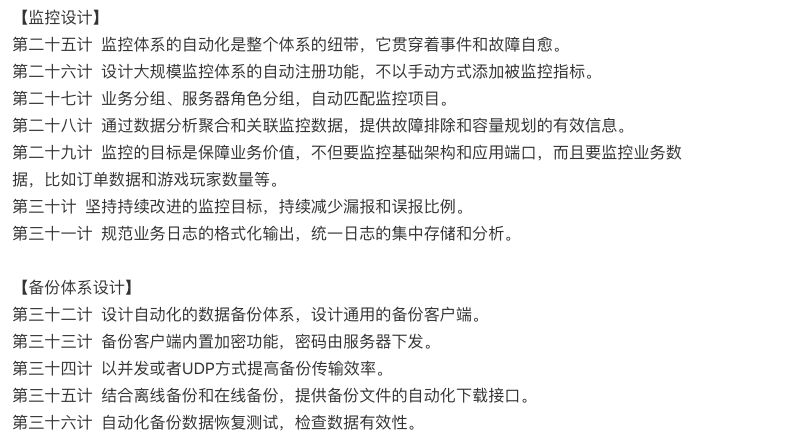 第二是考虑可扩展性。设计系统的时候,功能或者设计方面可能不用考虑那么多,但是要考虑当服务器数量发生比较大的扩张时,系统是否还能支撑,比如数量级从十到百,或者上千了,这个系统是否还是可用的。